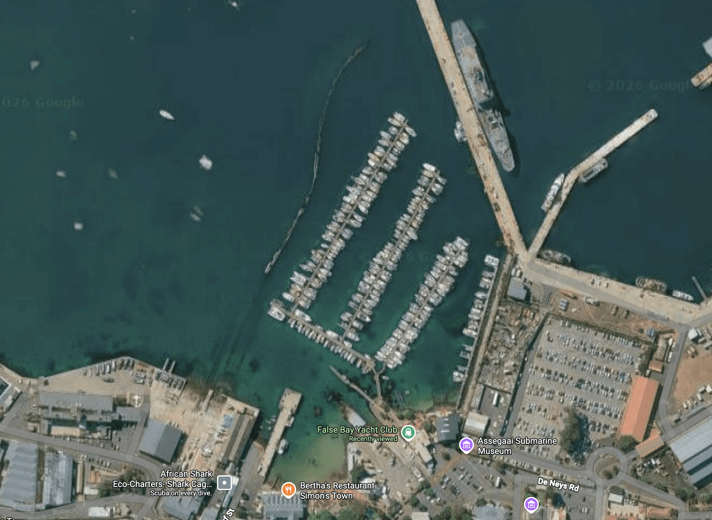 Approach Simon’s Town from False Bay, keeping clear of restricted naval areas. Enter Simon’s Town Harbour following marked channels and contact marina staff on VHF Channel 71 for berth allocation instructions. Be aware of naval traffic within the harbour.